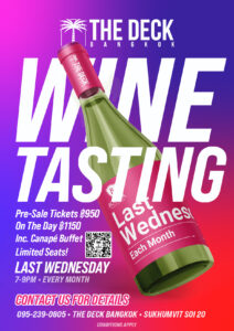Join us for an unforgettable evening of fine wine and delicious bites at The Deck Bangkok! Every last Wednesday of the month, we host an exclusive Wine Tasting Night in collaboration with Boozia, bringing a curated selection of wines to pair perfectly with our handcrafted canapés. Fancy a great time with a side of wine? You won’t want to miss this!